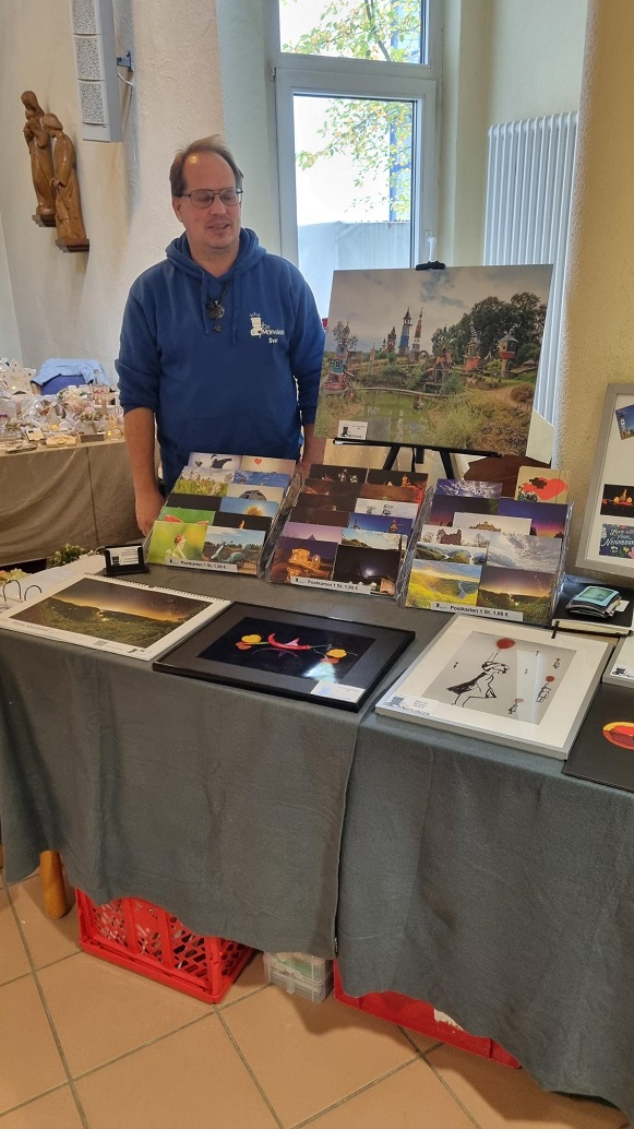 Auch diesesmal konnte an den Verkaufsständen nach Herzenslust eingekauft werden. Die unterschiedlichsten Dekorationsartikel und kleinen Geschenke wurden präsentiert. Die Marktstände von Markus Burckhardt mit Holzarbeiten, Bärbel Reiss mit handgenähten Artikeln, Petra Schneider-Hewer mit vielen, handgefertigten Deko-Artikeln und Sven Kley mit Postkarten, Kalendern und Bildern aus seinem Fotoatelier fanden großen Anklang. Die Kreativgruppe der Bewohnerinnen und Bewohner boten ihre selbst hergestellten Artikel - darunter Glasbilder und Windlichter - zum Verkauf an. Zusätzlich präsentierte Herr Lang, Fellerhoff Med Tec GmbH den "Volksrolli".